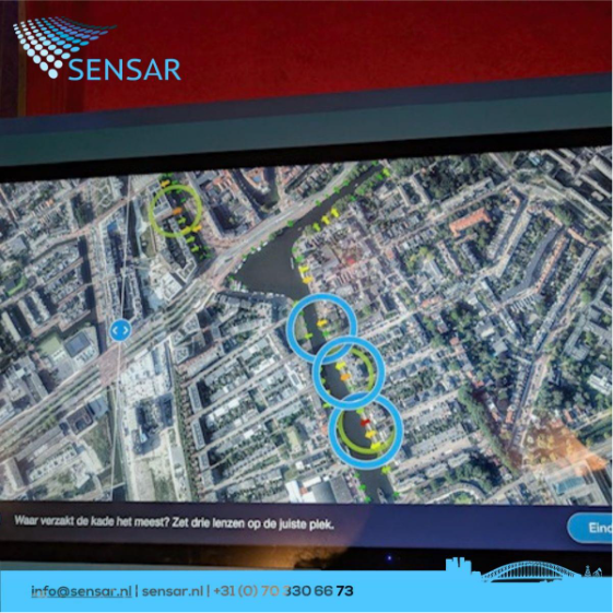 De opstelling bevindt zich in het gedeelte van de expositie dat draait om het gebruik van diverse soorten satellietgegevens. Sensar presenteert het interactieve spel ‘Waar verzakt de kade?’. Hier wordt getoond hoe radarsatellieten subtiele bewegingen kunnen meten. Bezoekers gaan actief op zoek naar instabiele kademuren en ervaren hoe deze technologie bijdraagt aan het veilig houden van onze infrastructuur.